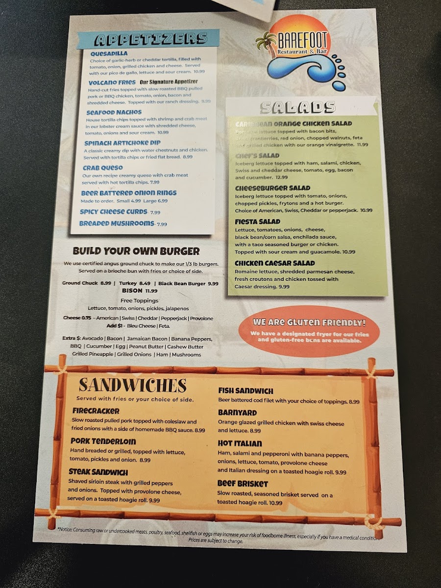 Fresh romaine lettuce topped with bacon bits, dried cranberries, diced red onions, feta crumbles, chopped walnuts, hot grilled jerk chicken, croutons, and our orange vinaigrette.